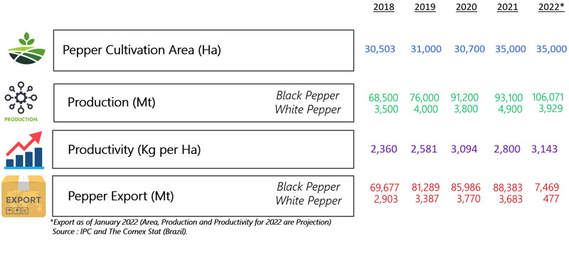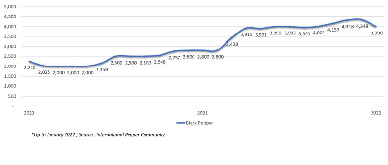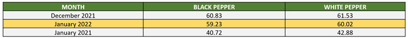 | 02 | IPC Price Index and Composite Price - Pepper price index in the beginning of 2022 reported slightly negative as index of the black pepper reported at 59.23 points, a drop by 2.6% while index of white pepper dipped by 2.4% to 60.02 points. Similarly, composite prices of the black and white pepper were also reported with a decreasing trend as composite price of black pepper lost USD 119 per Mt and reported at USD 4,406 per Mt. Whilst, composite price of white pepper recorded a slightly higher loss of USD 156 per Mt and reported at USD 6,211 per MT. |