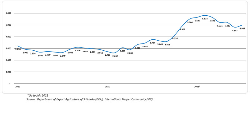 Monthly Average FOB Price of Black Pepper in Sri Lanka during 2020-2022* (USD/Mt)