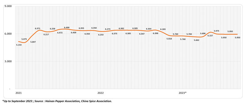 Monthly Average FOB Price of Black Pepper in China during 2021-2023* (USD/Mt)