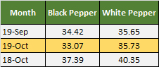 Composite price of black and white pepper for the 10th month of 2019 were reported with mixed response. Losing USD 100 per Mt as opposed to the previous month, the composite price of black pepper was reported at USD 2,460 per Mt. October 2019 saw composite price of white pepper recorded an increase of USD 8 per Mt as opposed to September 2019 and was reported at USD 3,697 per Mt (Table 2).