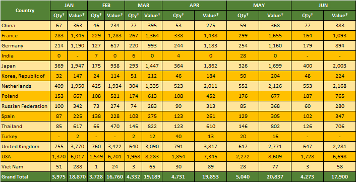 During January-June 2019, China was reported to have imported a total of 45,838 Mt with most of its pepper were reported to come from Viet Nam with 45,467 Mt.