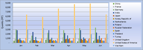 Furthermore, as of June 2019 Viet Nam's top 5 Country destinations for its pepper were reported to be China with 45,467 Mt (many cross border and undocumented trade), United States of America with 26,711 Mt, India with 13,945 Mt, Pakistan with 7,737 Mt and Germany with 6,871 Mt.