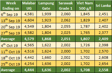 Farm gate price of black pepper in Viet Nam for October 2019 was reported to have decreased by 5% as opposed to previous month averaging at USD 1,708 per Mt. Whilst, Sri Lanka black pepper was reported to climb back up with an increase by 6% as opposed to the previous month and was reported at an average of USD 2,558 per Mt.