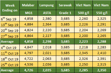 The price of black pepper in Indonesia (Lampung black pepper) recorded a significant deficit when compared to September 2019. The farm gate price of Lampung black pepper for October 2019 was reported to be at an average of USD 1,636 per Mt, recording a decrease of USD 232 per Mt or 12% as compared to the previous month. With a significant more yield this year, market was flooded with more stock which pushed down price in local currency to an average of IDR 23,132 per Kg. However, many farmers were reported to keep their pepper in the hope for a better price.