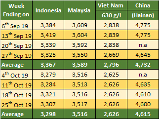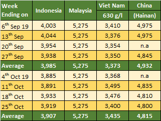 Pepper prices in 10th month of 2019, showed a mixed response with Indonesia origin was reported with the biggest drop as opposed to the previous month. The farm gate of black pepper in India was reported at an average of USD 4,444 per Mt (Table 3). Recording a 3% deficit when compared with September 2019. The impact of global oversupply and the continuous rise of pepper import to India flouting the MIP at Rs. 500/Kg (as many sellers provided fraudulent invoice of Rs. 500/Kg just to convince the Custom) have pushed India black pepper to reach its lowest price of the year. In the local currency farm gate price of India black pepper was traded at an average of INR 314 per Kg in October 2019. Following the new crops which will begin in December, the price could fall deeper.