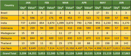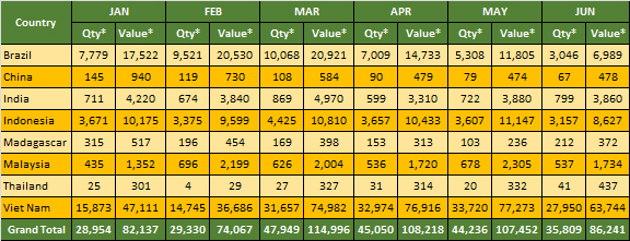 During January-June 2019, Viet Nam was reported to have imported a total of 16,407 Mt which comprised of 99% or 16,292 Mt of whole pepper and 1% or 116 Mt of ground pepper. Pepper imported by Viet Nam during the 1st semester 2019 fluctuated with the average of import pepper amounted to Mt 2,735 per month with the highest import reported in March with 3,859 Mt while the lowest import occurred in May with 1,939 Mt. The highest increase of pepper import by Viet Nam occurred in March with an increase by 17% or 558 Mt as compared with the previous month which only amounted to 3,301 Mt. In June 2019, Viet Nam imported a total of 2,021 Mt, thus recording a decrease of 34% or 1,028 Mt as compared with January 2019. By the end of the 1st semester 2019, Viet Nam's total expenditure of pepper import was reported to be as high as USD 35.9 Million.