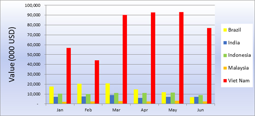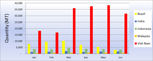 Furthermore, as of June 2019 Viet Nam's top 5 origin countries for its pepper were reported to be Indonesia with 11,695 Mt, Brazil with 4,528 Mt, Malaysia with 131 Mt, Korea with 31 Mt and China with 8 Mt.