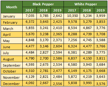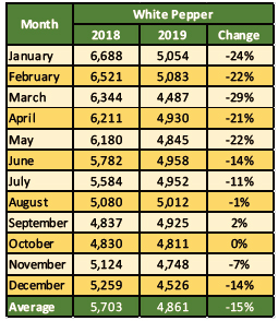 Contrary to black pepper, the price index of white pepper for the last month of 2019 experienced a loss by 1.8% as opposed to the previous month and was reported at 34.56 point. When compared with the same period in 2018, price index for white pepper suffered a greater loss by 10%. In 2019, the price index for white pepper was reported at an average of 36.08 point, recording a 17% loss when compared with the average in 2018 which was reported at 43.58 point