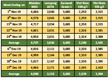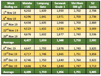 Pepper prices at the end of 2019, showed a mixed response with Sri Lanka origin recorded the highest increase as opposed to the previous month. Close to the harvest season, the farm gate price of black pepper in India was reported with rather significant increase by 6% as opposed to the previous month at an average of USD 4,699 per Mt (Table 3). In the local currency farm gate price of India black pepper was traded at an average of INR 334 per Kg. The increase of India black pepper price could also be contributed to the increase of the domestic demand due to the onset of winter. The price of black pepper in Indonesia (Lampung black pepper) was also reported with an increase of 6% as opposed to the previous month with an average of USD 1,739 per Mt. The increase of Indonesia black pepper could be contributed to the decreasing of stock in market and the farmers' reluctant to release at the current price point.