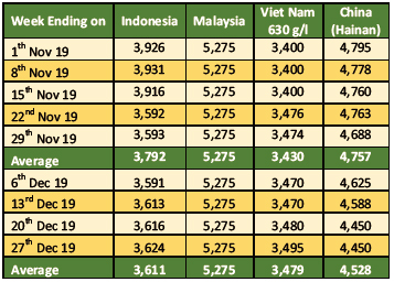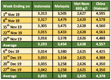 Farm gate price of black pepper in Viet Nam for December 2019 was reported to have increased by 2% as opposed to previous month averaging at USD 1,751 per Mt. Whilst, Sri Lanka black pepper was reported with a significant increase by 27% as opposed to the previous month and was reported at an average of USD 3,805 per Mt.