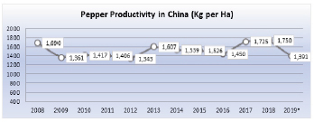 Pepper productivity in China in the past 12 years was reported to be fluctuated. During 2008-2012 pepper productivity in China was reported with a decrease by 21% with 1,343 Kg per Ha. whilst, in the following year pepper productivity in China was reported with an increase of 20% with 1,607 Kg per Ha. Furthermore, during 2013-2016 pepper productivity in China was reported with a 10% deficit to a total 1,450 Kg per Ha. Furthermore, between 2016-2018, pepper productivity in China saw an increase of 21% with 1,750 Kg per Ha. In the past 12 years pepper productivity in China was reported to have increased by 4%. The highest pepper productivity in China was reported in 2018 with 1,750 Kg per Ha whilst, the lowest China pepper productivity occurred in 2012 with 1,343 Kg per Ha.