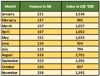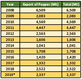 The number of pepper exports from China has reportedly fluctuated in 2019. As of November 2019, the total export by China was reported at 2,337 Mt with total value as high as USD 13.5 Million. The average pepper export from China was 212 Mt per month with an average value of USD 1.2 Million per month. As of November 2019, the highest export occurred in August with quantities reaching 526 Mt (Table 9). The high level of exports during that period correlated closely to China harvest season so that the stock of pepper was relatively high.