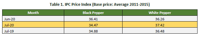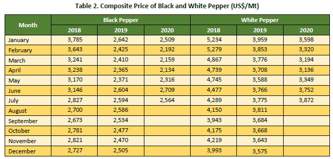 The 7th month of 2020 saw the price index with a mix response. The price index of black pepper was reported at 34.47 points, recording a decrease by 5.3% as compared to the previous month or a slight decrease by 1% when compared with the same month in 2019. In contrast, price index of white pepper for the 7th month of 2020 was reported with an increase by 1.16 point as compared with June 2020 to 37.42 points (Table 1). When compared with the same month in 2019, price index of white pepper was reported with an increase of 3%.