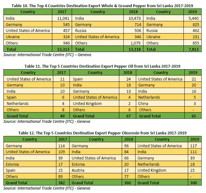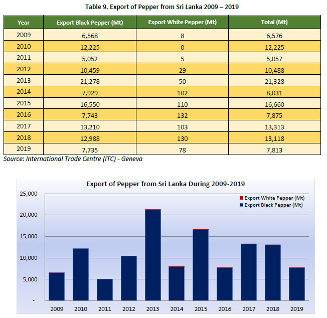 As one of pepper producing country, Sri Lanka had managed to steadily achieve an average export around 11,000 Mt of pepper annually. Since 2009 until 2019 there had been a 19% increase in number of exports from Sri Lanka. Furthermore, during 2009 to 2019 pepper export from Sri Lanka was mainly dominated with black pepper with an average of 99% of the total export figures. Furthermore, the highest pepper export occurred in 2013 with 21,328 Mt whilst the lowest export occurred in 2011 with only 5,057 Mt (Table 9). In 2019, pepper export from Sri Lanka was reported at 7,813 Mt which comprised of 7,735 Mt of black pepper and 78 Mt of white pepper, thus, recording a decrease of 40% as opposed to the previous year.