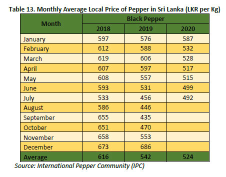 In the course of January until July 2020, the average local price of Sri Lanka black pepper were reported at LKR 524 per Kg, thus recording an average decrease of 6% as compared to the same period in 2019 (Table 12).