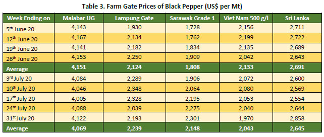Pepper prices in the 7th month of 2020, showed a mixed response. The farm gate price of black pepper in India was reported with a decrease of 2% as opposed to June, averaging at USD 4,069 per Mt (Table 3). In the local currency farm gate price of India black pepper was reported at an average of INR 304 per Kg which was a decreased from INR 313 per Kg in the previous month. The decrease of India black pepper local price could be contributed to the rising pepper imports during the first half of the current year as imports from Sri Lanka for domestic use had shot up. Pepper from Sri Lanka has a concessional import duty of only 8% as per the bilateral agreement between India and Sri Lanka.
