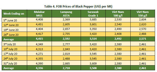 FOB price of black pepper for June 2020 continued the trend of the farm gate price with only Indonesia origin was reported with an increase. India traded its Malabar black pepper internationally with the same decrease by 2% when compared to June, averaging at USD 4,336 per Mt (Table 4). Furthermore, the FOB price of Indonesian black pepper was reported with an increase of 5% as opposed to June, averaging at USD 2,718 per Mt. FOB price of Malaysian black pepper was reported stable with a slight decrease at an average of USD 3,508 per Mt. As the global pepper trade being affected with the looming threat of the second wave of the Corona Virus pandemic, FOB price of Viet Nam black pepper 500 g/l and 550 g/l were reported with a decrease of 4% respectively as compared to the previous month averaging at USD 2,380 per Mt and USD 2,461 per Mt respectively.