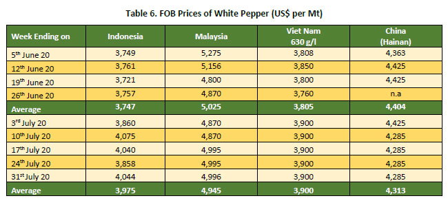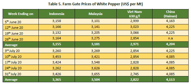 Farm gate prices of white pepper in July 2020 showed a mixed response (Table 5) with only Indonesia and Malaysia origin were reported an increase. Indonesia Muntok white pepper was reported with an increase of 7% as compared to the previous month at an average of USD 3,365 per Mt. In local currency, the price of Muntok white pepper was reported at an average of IDR 49,136 per Kg, an increase of IDR 4,184 per Kg when compared with the previous month. Similar to black pepper, the increase of Indonesia white pepper could be contributed to the increase of demand while the stock was limited. Farm gate price of Malaysia white pepper was reported with a significant increase of 10% as opposed to June at an average of USD 3,504 per Mt. Furthermore, Viet Nam white pepper was reported with a decrease of 5% when compared to the previous month, averaging at USD 2,822 per Mt. China white pepper was reported with a decrease of 2% as opposed the previous month and was traded at an average of USD 4,113 per Mt locally.