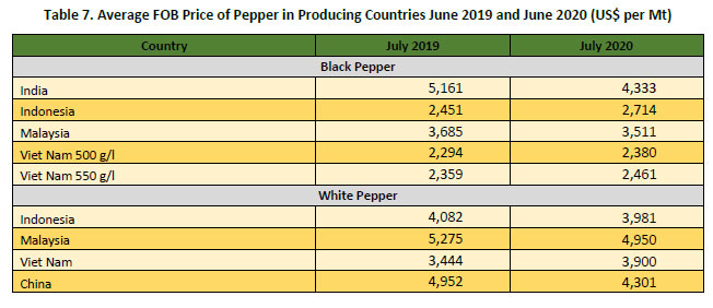 Entering the 6th month of global pandemic, FOB pepper price for July 2019 and July 2020 fluctuated. India black pepper in July 2020 was reported with 16% deficit as compared to July 2019 at an average of USD 4,333 per Mt. Furthermore, Indonesia black pepper was reported with an increase of 11% as compared to July 2019 averaging at USD 2,714 per Mt whilst Indonesia white pepper was reported with 2% deficit as compared with July 2019 averaging at USD 3,981 per Mt. Malaysia black and white peppers for July 2020 were reported with a decrease of 5% and 6% respectively as compared to July 2019 at an average of USD 3,511 per Mt and USD 4,950 per Mt respectively. Furthermore, Viet Nam black pepper 500 g/l, 550 g/l and Viet Nam white pepper were reported with an increase of 4%, 4% and 13% respectively as opposed to the same period in 2019 at an average of USD 2,380 per Mt, USD 2,461 per Mt and USD 3,900 per Mt respectively. China white pepper was reported with 13% deficit when compared to July 2019 and was traded at an average of USD 4,301 per Mt (Table 7).