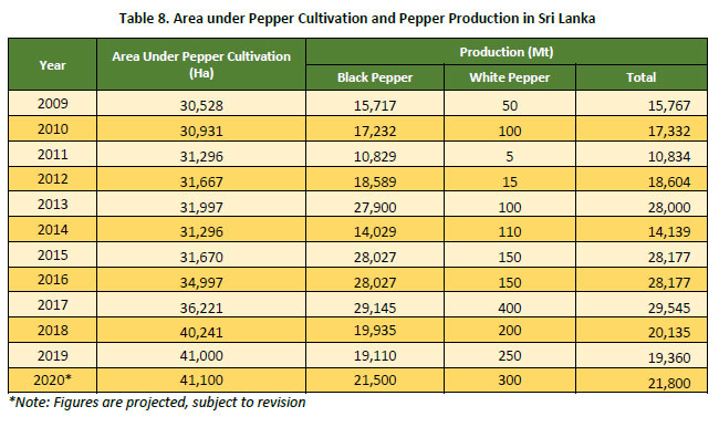Pepper production of Sri Lanka had fluctuated since 2009 with a rather positive trend. Pepper production of Sri Lanka was reported to have recorded an increase of 23% in the past 11 years as it recorded to have produced a total of 19,360 Mt in 2019 which comprised of 19,110 Mt of black pepper and 250 Mt of white pepper. The highest production of Sri Lankan pepper in the past 11 years was reported in 2017 with 29,545 Mt which comprised of 29,145 Mt of black pepper and 400 Mt of white pepper. The high production in 2017 could be contributed to increasing trend of the local price of Sri Lankan black pepper starting from 2015 and reached its peak in 2016 at an average of LKR 1,246 per Kg which is the highest in the past 10 years. Thus, motivated farmers to open new area and plant more during that period. In addition, the production of Sri Lankan pepper for 2020 was projected with an increase of 13% when compared to 2019 at 21,800 Mt.
