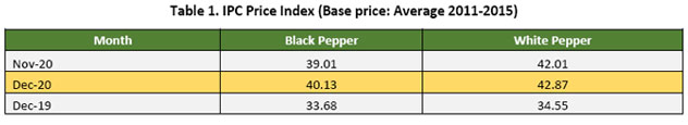 Despite being one of the most challenging year, price index of pepper in the closing month of 2020 was reported with a positive outlook. The price index of black pepper for December 2020 was reported at 40.13 points, recording an increase of 2.9% as compared to November 2020 and 19% increase as compared to December 2019. Continuing the same trend, Price index of white pepper for December 2020 was reported with 2.1% increase when compared with November 2020 at 42.87 points (Table 1). However, when compared with December 2019, the price index of white pepper recorded a 24% increase.