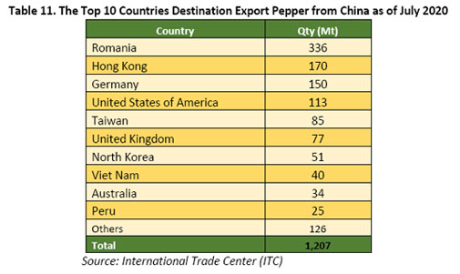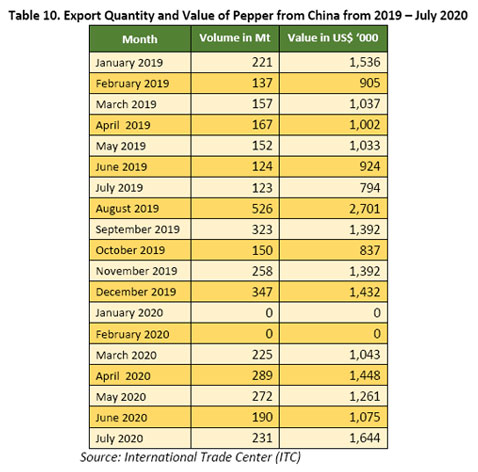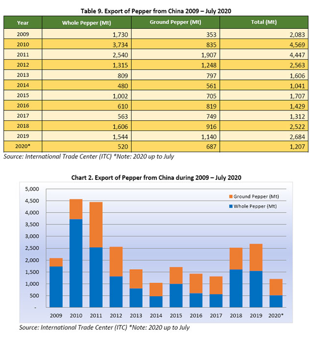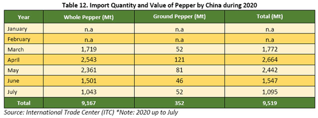 In the first 2 months of 2020, Business in China was reported to be inactive due to the global pandemic that emerged at the end of 2019. As of July 2020, China imported a total of 9,519 Mt which comprised of 9,167 Mt of whole pepper and 352 Mt of ground pepper (Table 12).