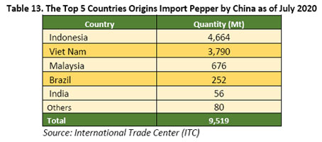 The top five countries of origins of China's pepper as of July 2020 were reported to be Indonesia with 4,664 Mt (Contributed to 49% of the total China pepper import as of July 2020), Viet Nam with 3,790 Mt (40%), Malaysia with 676 Mt (7%), Brazil with 252 Mt (3%) and India with 56 Mt (1%) (Table 13).