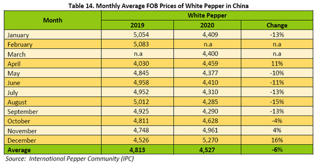 In 2020, the average FOB price of China white pepper was reported at USD 4,527 per Mt. Thus, recording a decrease by 6% when compared to 2019. The highest FOB price of China white pepper in 2020 was reported in December with an average of USD 5,270 per Mt, recording an increase by 16% as compared to the same period in 2019. Whilst, the lowest occurred in August with USD 4,285 per Mt, recording a deficit by 15% as compared to the same period in 2019 (Table 14).