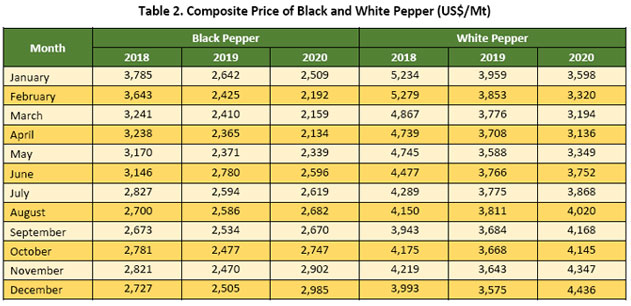 Align with the price index, the composite prices at the end of 2020 were reported with a positive outlook. The composite price of black pepper was reported at USD 2,985 per Mt (Table 2), recording an increase by USD 83 per Mt as compared to November 2020. In addition, the average composite price of black pepper for the entire 2020 was reported at USD 2,545 per Mt, recording a slight increase of 1% as compared to the average composite price of black pepper in 2019. Following the positive trend, the composite price of white pepper was reported at USD 4,436 per Mt recording and increase by USD 89 per Mt as compared to November 2020. Whilst, the average composite price of white pepper for the whole year of 2020 was reported at USD 3,778 per Mt, recording a slight increase of 1% as compared with the average composite price of white pepper in 2019.