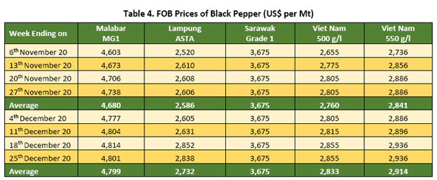 FOB price of black pepper for December 2020 showed a rather positive outlook with only Malaysia origin was reported unchanged. The FOB price of Malabar black pepper from India was reported with an increase of 3% when compared to the previous month, averaging at USD 4,799 per Mt (Table 4). Furthermore, the FOB price of Indonesian black pepper was reported with an increase of 6% as opposed to November, averaging at USD 2,732 per Mt. FOB price of Malaysian black pepper was reported stable and unchanged. FOB price of Viet Nam black pepper 500 g/l and 550 g/l were reported with an increase of 3% respectively as compared to the previous month, averaging at USD 2,833 per Mt and USD 2,914 per Mt respectively.