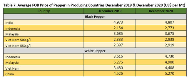 Entering the 12th month of global pandemic, FOB price of peppers in comparison between December 2019 and December 2020 fluctuated with an increasing trend. India black pepper in December 2020 was reported with 3% deficit as compared to the same period in 2019 at an average of USD 4,807 per Mt. Furthermore, Indonesia black and white pepper were reported with an increase of 29% and 31% respectively as compared to December 2019, averaging at USD 2,773 per Mt for black pepper and USD 4,730 per Mt for white pepper. Malaysia black pepper was reported stable averaging at USD 3,675 per Mt. Whilst, Malaysia white pepper was reported with 7% deficit as compared to the same period in 2019 to an average of USD 4,900 per Mt. Furthermore, Viet Nam black pepper 500 g/l, 550 g/l and Viet Nam white pepper were reported with an increase of 22%, 22% and 27% respectively as opposed to the same period in 2019 to an average of USD 2,838 per Mt, USD 2,919 per Mt and USD 4,408 per Mt respectively. China white pepper was reported with an increase of 16% when compared to December 2019 and was traded at an average of USD 5,270 per Mt (Table 7).