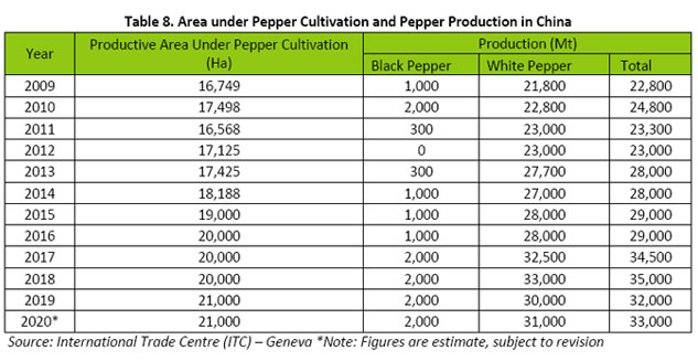 During 2009 to 2019 the area under pepper cultivation in China had shown an increasing trend with only 2011 was reported with a decrease as compared to the previous year. As it recorded a decrease by 5% to 16,568 Ha in 2011. As from 2012, the area under pepper cultivation in China was reported with an increasing trend to 2019. In 2019, China planted pepper on 21,000 Ha of area, recording an increase of 25% over the course of 11 years (Table 8). In addition, the area under pepper cultivation for 2020 was estimated to be stable and unchanged.
