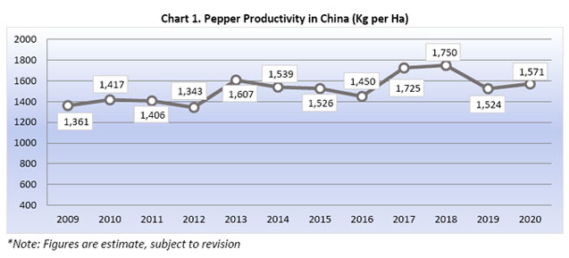 Pepper productivity in China in the past 11 years fluctuated with a positive trend (Chart 1). From 2009 until 2019 pepper productivity in China had been reported with an increase by 12% totaling at 1,524 Kg per Ha in 2019. The highest pepper productivity in China in the past 11 years was reported in 2018 with 1,750 Kg per Ha. In 2020, pepper productivity in China was estimated to increase by 3% as compared with the previous year to a total of 1,571 Kg per Ha.
