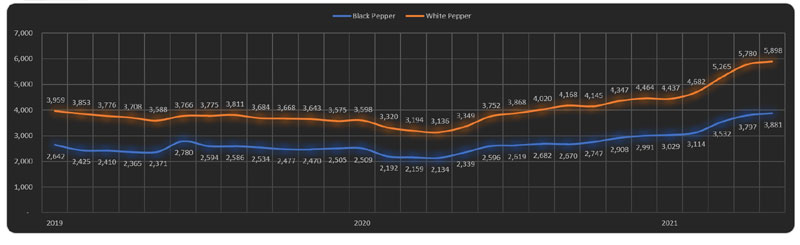 | 02 | IPC Price Index and Composite Price – Price index of pepper both recorded 2% spike. Composite price of black pepper was at USD 3,881 per Mt whilst white pepper at USD 5,898 per Mt.