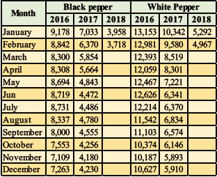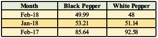 FOB prices decreased by US$ 50 per Mt to US$ 3,500 per Mt for black 550/L while for white pepper increased marginally by US$ 100 per Mt to 5,150 Mt at the month\'s close. When compared to FOB price in February 2017, the price decreased by 40% from US$ 5,850 for black and 43% from US$ 8,960 for white pepper.