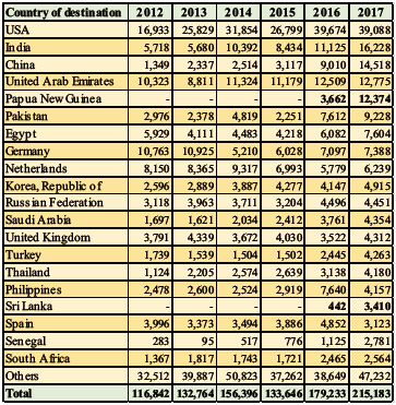 It is interesting to note that, Papua New Guinea emerged as the new important destination for Viet Nam imported 12,400 Mt in 2017. There is an assumption that substantial quantity of pepper goes to PNG in 2017 may transported to Indonesia by land since production of black pepper in Indonesian decreased significantly in the year. Other new important destination is Sri Lanka which imported 3,400 Mt from only 442 Mt in 2016. Export to Pakistan also increased significantly in the last two year too. It was reported some pepper imported by Pakistan and Sri Lanka from Viet Nam was re-exported to India for industrial uses. Table below shows export development from Viet Nam in 2012- 2017.