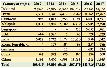 Beside exports huge quantity, Viet Nam also imported significant quantity mainly from Cambodia, Brazil and Indonesia. Viet Nam Pepper Association (VPA) estimated a volume of around 35,000 Mt was imported in 2017. According to official source, Viet Nam has imported pepper at a value of US$ 68 million in 2017. Assumed unit price of pepper imported in 2017 was between US$ 3,500 to 4,000 per Mt, total recorded import in 2017 was around 17,000-19,500 Mt. It means around 15,500-18,000 Mt of pepper import was unrecorded possibly in the form of cross border trade with its neighbors. Recorded import of pepper by Viet Nam in value term during 2012-2017 is shown below: