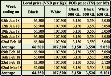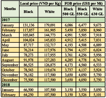 In February 2018 local price of black pepper in Viet Nam decreased from VND 66,500 per Kg to VND 62,000 per Kg at the month\'s close. On an average the price was VND 64,250 per Kg, showing a decrease of 3% when compared to previous month average at the level of VND 66,500 per Kg. The price also dropped by 50% from the average price in early 2017. In respect of white pepper the price reported stable at VND 107,500 per Kg during the last two months.