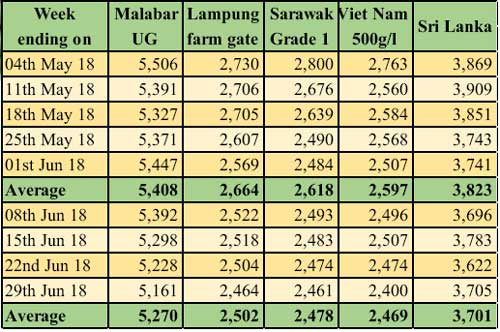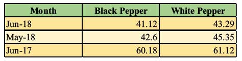 During June 2018, local price of Malabar black pepper price in Kochi decreased by INR 1.0 per Kg to INR 353 per Kg. When compared to average price in the previous month, the local price decreased marginally by 3%. In Lampung and Bangka the market was inactive, although initial harvest of pepper has started. Local price of black pepper in Lampung and Bangka has stood at the lowest level of IDR 35,000 and INR 55,000 per kg respectively for black and white pepper. When compared to average price in previous month, there was a decrease of IDR 2,500 per Kg.