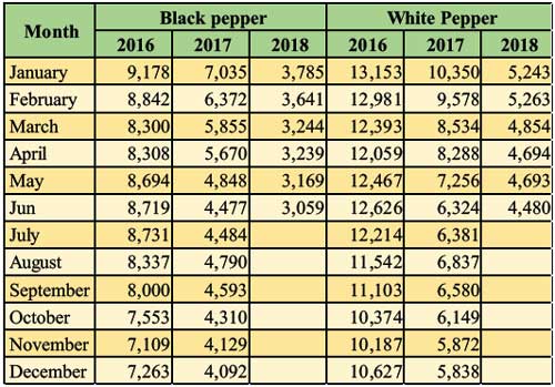 During June 2018, the Pepper Price Index decreased by 1.48 points for black pepper and 2.06 points for white pepper (Table 1). The composite price of black pepper decreased by 3.5% from US$ 3,170 in May 2018 to US$ 3,060 per Mt in June 2018 while that of white pepper decreased by 4.5% from US$ 4,693 per Mt in May to US$ 4,480 in June 2018 (Table 2).