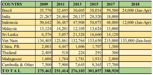 Last year (2017) production of pepper is reportedly to have touched 500.000 Mt. This production level was substantially higher when compared to production level in 2016 at 429,000 Mt, an increase of around 17% from the previous year and 40% from the average production during previous five years period of price increasing trend at 370,000 Mt in 2011-2015. This achievement was largely because of the substantial increase of pepper production in Viet Nam and Brazil. Today the share of Viet Nam in the world production of pepper is around 40% followed by Indonesia and Brazil (15% and 12% respectively). Most of their produce is exported owing to low domestic consumption.