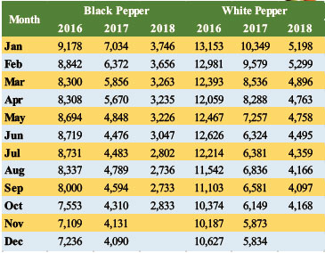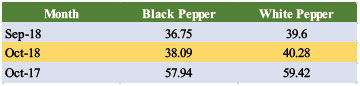 Price index of pepper in October 2018 experienced a varied increase. The price index for black pepper increased by 1.34 points, while white pepper experienced an increase of 0.68 points compared to September 2018 (Table 1). The composite price of black pepper followed the increasing trend by 3.65% to US$ 2,833 per MT opposed to US$ 2,733 per MT in the previous month. Though it recorded a slightly lower margin the composite price for white pepper also increased by 1.73% from US$ 4,097 per MT in September to US$ 4,168 per MT.