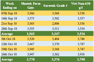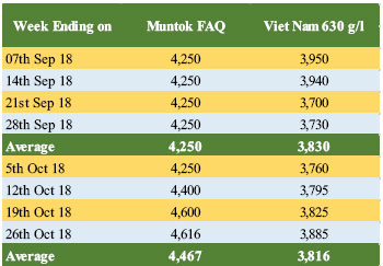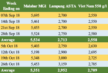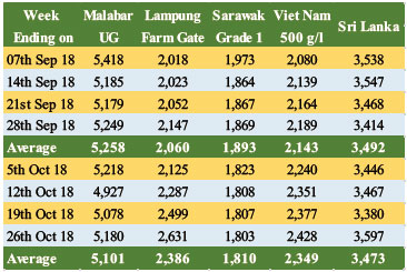 FOB prices of Muntok White was reported to have experienced price increases (Table 6). In September the price of Muntok White Pepper was USD 4,250 per MT, while in October it was reported to have increased to USD 4,467, recording an increase of 5%. Furthermore, in Viet Nam, FOB Price for white pepper was also reported to increase albeit marginally.