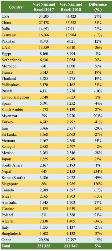 Viet Nam and Brazil also export more pepper to Poland, Ukraine Morocco, and China. Demand by Poland, Morocco, Ukraine, and China increased by 91%, 56%, 46%, and 31% respectively from the previous year in the same period. Furthermore, Viet Nam and Brazil also exported 43,423 MT of pepper to the USA in 2018, 27% higher than in 2017 with a quantity of 34,205 MT. The increase recorded in these countries was due to their role as re-exporters of pepper and also the increase in domestic consumption.
