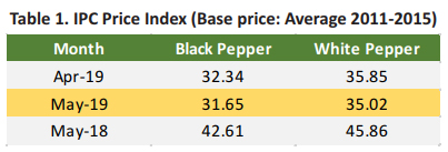 Prices index in May 2019 continued its negative trend. Price index of black pepper was reported with a decline of 0.69 points as compared with April 2019. When compared with the same period in 2018, price index of black pepper recorded 26% loss. Furthermore, price index of white pepper was reported at 35.02 (Table 1) recording a 2.3% loss as compared with the previous month and 10.83 points decline when compared with the same period in 2018.