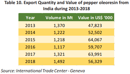 The number of pepper oleoresin exports from India was reportedly fluctuated during 2013-2018. During 2013 to 2016 pepper oleoresin exports from India was reported decreasing by 18% resulting to quantities dropping to 1,117 Mt of pepper oleoresin with value of USD 59.7 Million. Furthermore, in 2018, pepper oleoresin was reported with an increase by 13% as compared with 2017 with quantities reaching 1,492 Mt and amounting value of USD 56.3 Million (Table 10).
