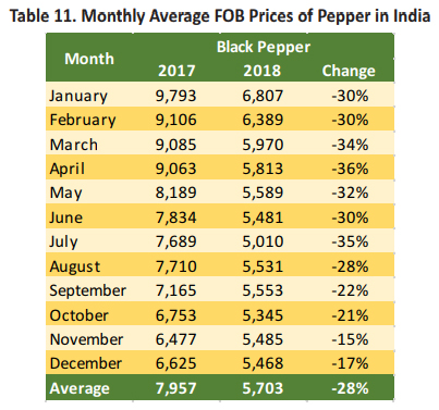 In 2018, the average FOB price of Indian black pepper was reported at USD 5,703 per Mt, recording a decreased of 28% as compared to the same period in 2017. In 2017, the highest price of Indian black pepper was reported to have reached USD 9,793 per Mt (Jan 2017), whereas in 2018 the highest price was only USD 6,807 per Mt (Jan 2018), recording a 30% decreased as compared to the year 2017. The lowest price of India black pepper was reported during July 2018 which reached as low as USD 5,010 per Mt, recording a deficit of 35% as compared to the same period in 2017.