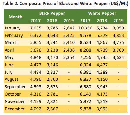 Composite prices for May 2019 was reported with a slight deficit as compared with April 2019. Composite price of black pepper was reported at USD 2,354 per Mt, recording 2.1% deficit or losing USD 52 per Mt (Table 2). Furthermore, composite price of white pepper recorded USD 85 per Mt loss or 2.3% deficit when compared with the previous month and was reported at USD 3,624 per Mt.