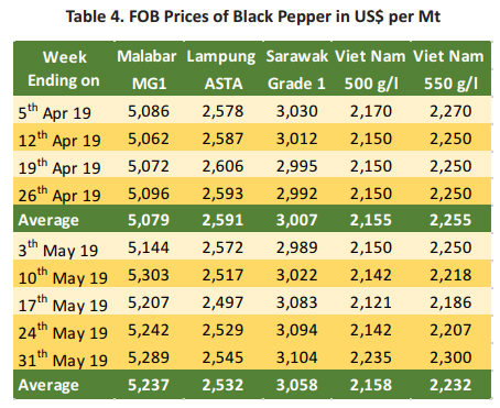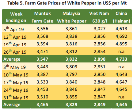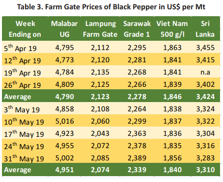 Pepper prices in the 5th month of 2019 experienced a mixed trend in several producing countries (Table 3). The farm gate prices of black pepper in India was reported at an average of USD 4,951 per Mt. Thus, recording an increase of 3% when compared with the average price in April 2019. The increase in price of black pepper in India could be contributed to the increase of the price in the local currency which amounted to an average of INR 346 per Kg from INR 332 per Kg in April 2019. The price of black pepper in Indonesia (Lampung Black Pepper) weakened when compared to April 2019. The farm gate prices of Lampung black pepper for May 2019 was reported to be at USD 2,074 per Mt, recording a decrease of USD 49 per Mt or 2% compared to the previous month. The weakening of Indonesian Rupiah towards US Dollar had led to a decrease in pepper prices in Lampung as the price in local currency remained at the same level at an average of IDR 30,000 per Kg.