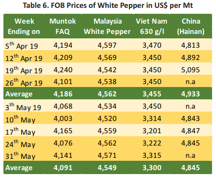 FOB price of white pepper was reported to have experienced the similar responses as farm gate. FOB price of white pepper in Indonesia in May 2019 was reported declining by 2% when compared to April 2019 and was reported at an average of USD 4,091 per Mt. Furthermore, FOB price in Malaysia was reported to be relative stable at an average of USD 4,549 per Mt. Whilst, Vietnam and China origins were reported declining by 5% and 2% respectively and were traded at an average of USD 3,300 per Mt and USD 4,845 per Mt respectively (Table 6).